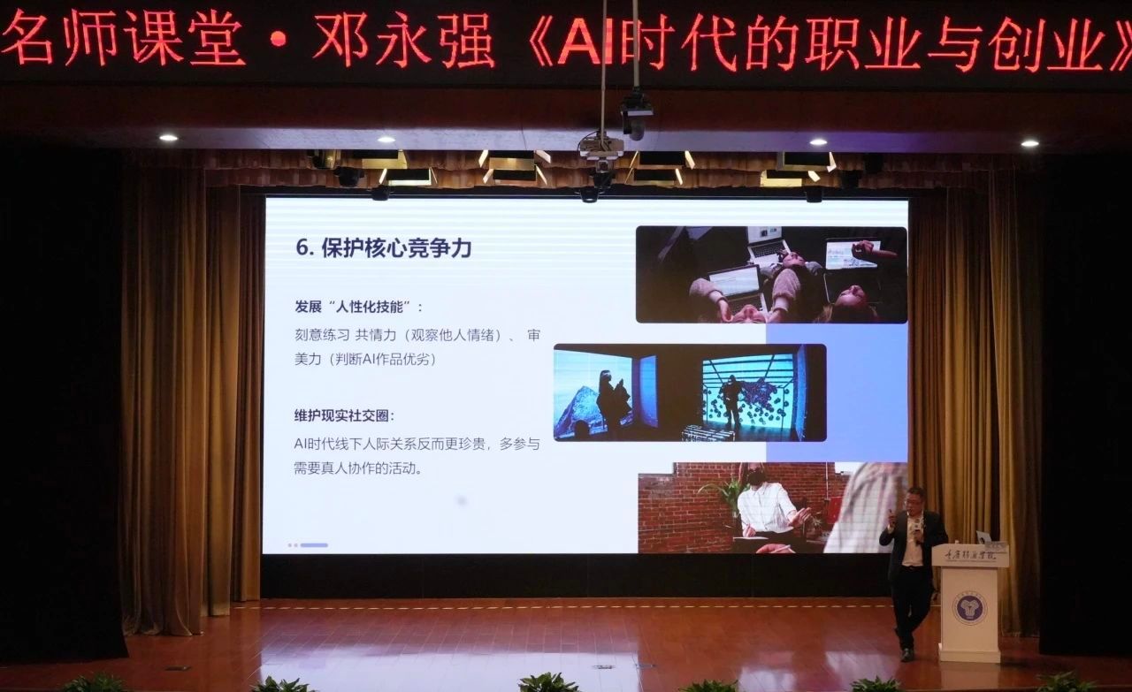 在科技飞速发展的当下,人工智能正以前所未有的速度融入人们的生活与工作,深刻重塑职业格局,也为创业领域带来无限可能。2025年4月21日至23日,英诺创新空间创始合伙人、清华校友总会互联网与新媒体专委会秘书长邓永强,走进重庆移通学院,为师生们带来了三场深度解读AI时代职业与创业的讲座,在校园内掀起了探索AI前沿科技的热潮。