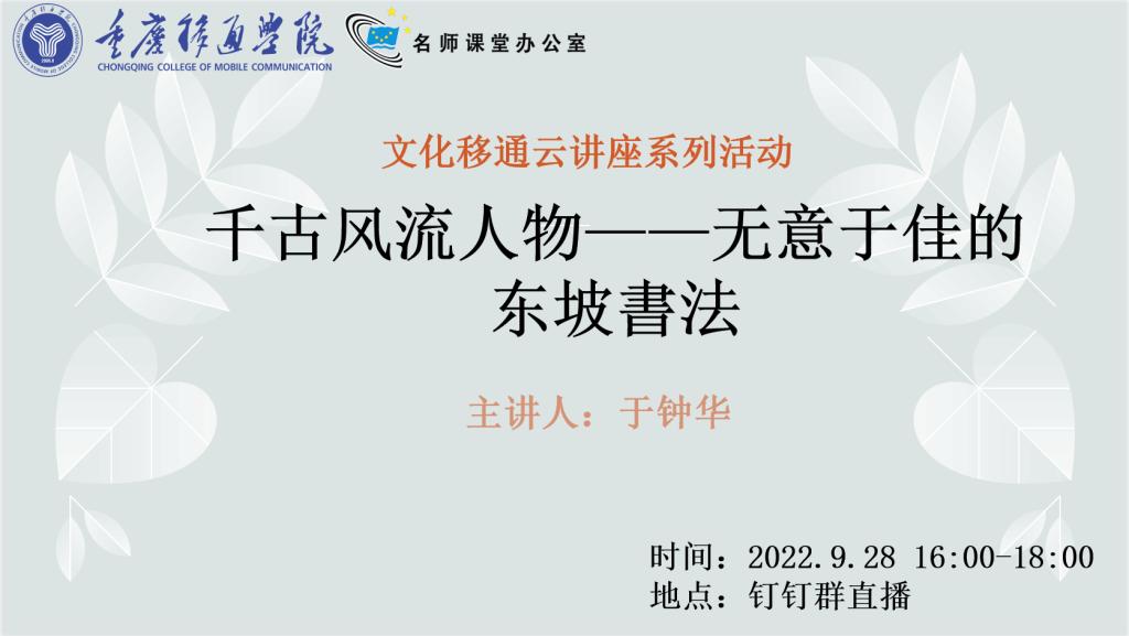 “一点浩然气,千里快哉风。”当东坡的作品携着明丽的色彩,浩浩荡荡地穿空而过;当几纸金墨伴着喧嚣散落,又是怎样一种气概,用豪情冲破了逆流。9月28日下午4点,文化移通线上研讨会带来了于钟华教授的《千古风流人物————无意于佳的东坡书法》一课,带领同学们一同倾听那被岁月洗礼的历史故事,感悟苏东坡先生一生的传奇经历。