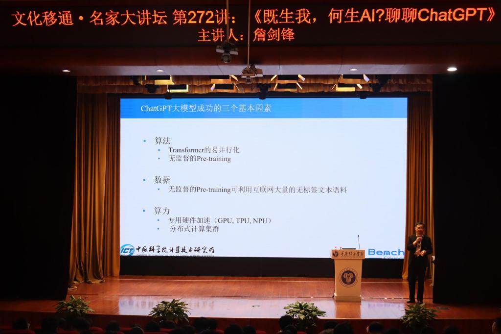 2022年11月30日,一种名为ChatGPT的大型自然语言处理模型出世,引起了全世界轩然大波。重庆移通学院邀请到了中科院计算所研究员,先进计算机研究中心主任詹剑锋教授,于2023年2月23日做客“文化移通——名家大讲坛”,并在下里巴人剧场为同学们开展了主题为《既生我,何生AI?聊聊ChatGTP》的讲座,向同学们展示了当下热点ChatGPT的发展历程以及其计算的优势与存在的问题。