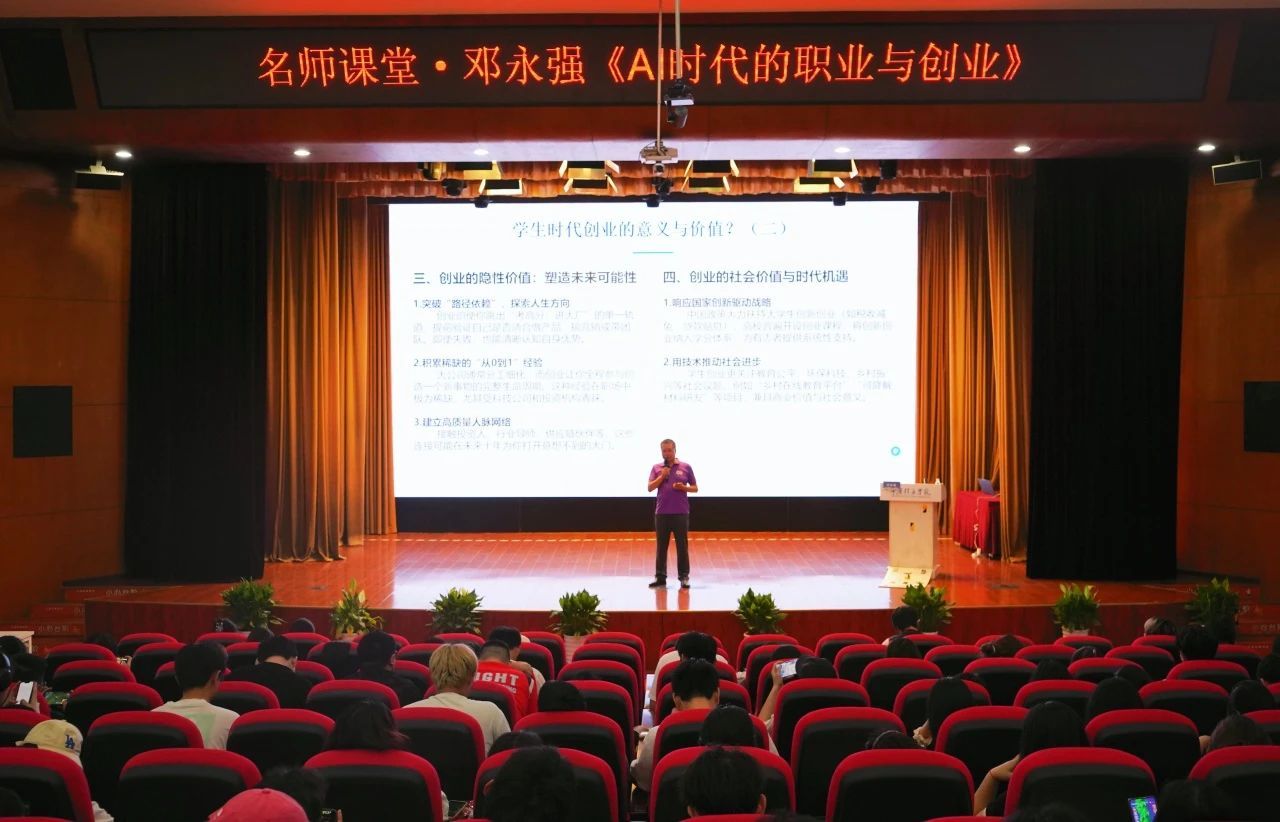 在科技飞速发展的当下,人工智能正以前所未有的速度融入人们的生活与 工作,深刻重塑职业格局,也为创业领域带来无限可能。6月17日下午16: 00,邓永强老师莅临“文化移通——名师课堂”,在下里巴人剧场带来了一场题为《AI 时代的职业与创业》的讲座。邓永强老师以其敏锐的洞察力,为在场 师生深度剖析了AI 浪潮下的职业图景与创业新机。