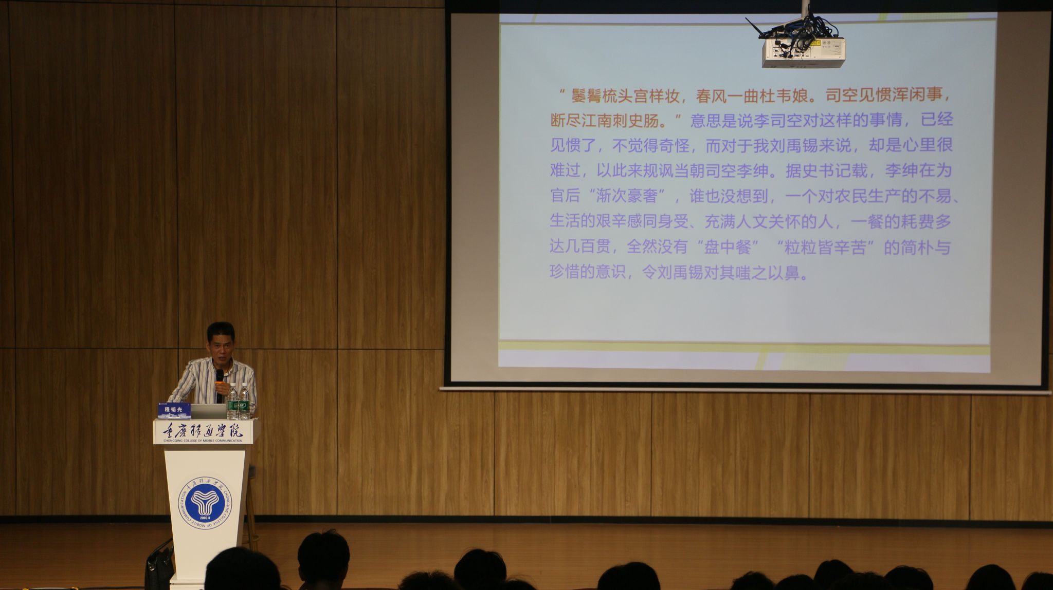 程韬光教授以刘禹锡的传奇人生为引,娓娓道来这位诗豪的跌宕历程。从少年登科、仕途起步,到投身“永贞革新”,再到革新失败后的辗转贬谪,刘禹锡始终以乐观豁达之心面对命运起伏。程教授特别指出,《陋室铭》正是这种精神的绝佳注脚,在讲解韵律之美时,程教授即兴吟诵,以抑扬顿挫的声调展现《陋室铭》的平仄韵律,让在场听众真切感受到唐诗的音律之美。