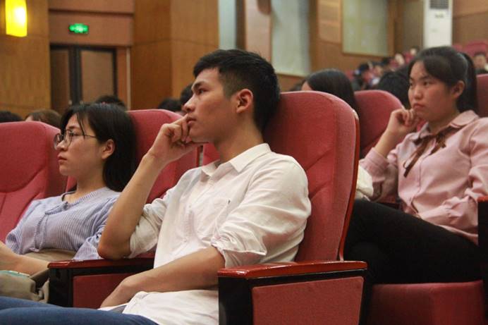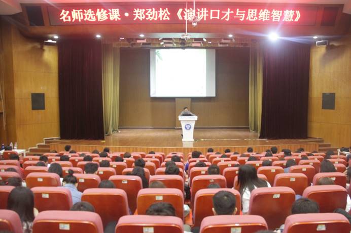 郑老师多年来在各种演讲比赛中积累了丰富的经验。不仅自己多次获得各项比赛奖项,在老师指导下,学生也在大大小小的赛事中拔得头筹。郑老师不断以自己的“实战”经验举例,生动地为同学们讲述了演讲中智慧思维的魅力。例如:在提到演讲中的政治话语时,郑老师以自己当年撰写的数篇演讲稿为例,其论点都来自于他精心查找的相关资料,而这些他在演讲中所提到的观点都与后来的时代热点不谋而合。“这就是演讲中政治话语的远瞻性。”郑老如此说道。