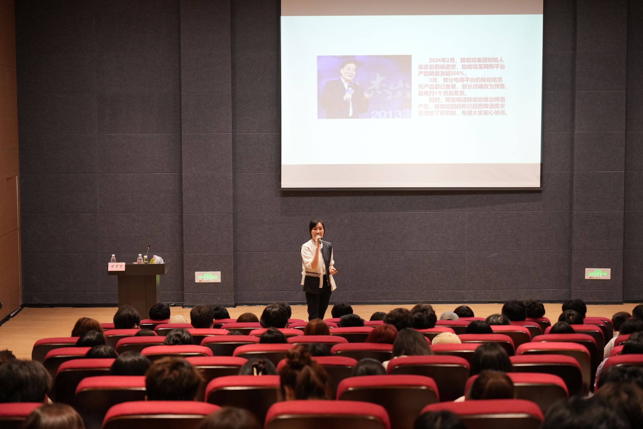 “最近你有喝过娃哈哈吗?”陈星颖老师以前段时间哇哈哈销量暴涨500%的案例引起同学们的思考,为什么娃哈哈的销量会迅速攀登到一个前所未有的高峰?陈星颖老师给出了她的答案,第一:网络宣传,在娃哈哈的创始人——宗庆后去世后,网络上铺天盖地的出现缅怀宗老,怀念宗老的评论,一定程度上对娃哈哈产品的销售起了一定的积极作用。第二:以诚待人,以信为本。在娃哈哈销量暴增后,许多人开始挖掘娃哈哈的“细节”,例如,娃哈哈纯净水一瓶净含量为596ml,也许没有人在意这4ml,但是对于宗老和娃哈哈企业来讲,这4ml就是诚信的底线。
