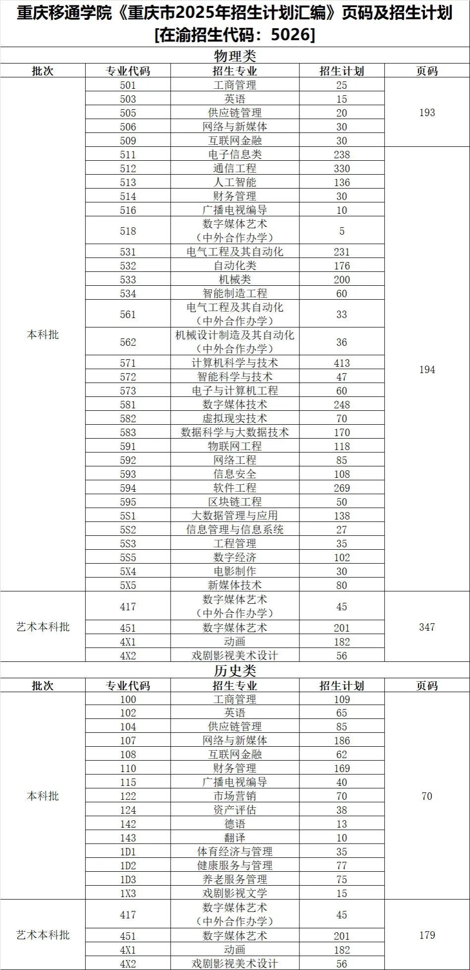 2025年,重庆移通学院在渝招生计划5188名,其中重庆物理类招生计划3655名,重庆历史类招生计划1049名,重庆美术类招生计划484名。