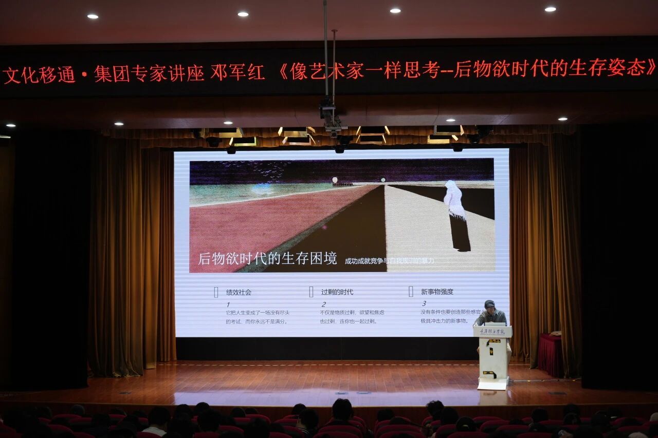 11月4日,重庆移通学院合川校区下里巴人剧场座无虚席,一场主题为《像艺术家一样思考——后物欲时代的生存姿态》的讲座在此热烈开讲。新商科大学集团专业教育委员会委员,人文学科带头人, 重庆移通学院艺术传媒学院特聘教师邓军红探讨了面对未知和不确定性时的恐惧,提倡通过接纳生命的不完美和流动变化来找到安全感的方法,为现场学子带来了一场兼具理论深度与实践价值的分享。