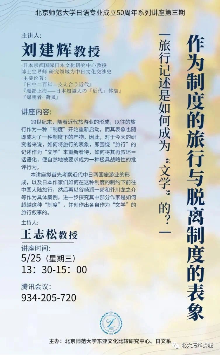 【内容】本讲座拟首先考察近代中日两国旅游业的形成,以及日本作家们如何在这种制度的制约下前往中国大陆旅行,然后再以谷崎润一郎和芥川龙之介等作为具体案例,进一步探究其中部分作家是如何超越这种“制度”
