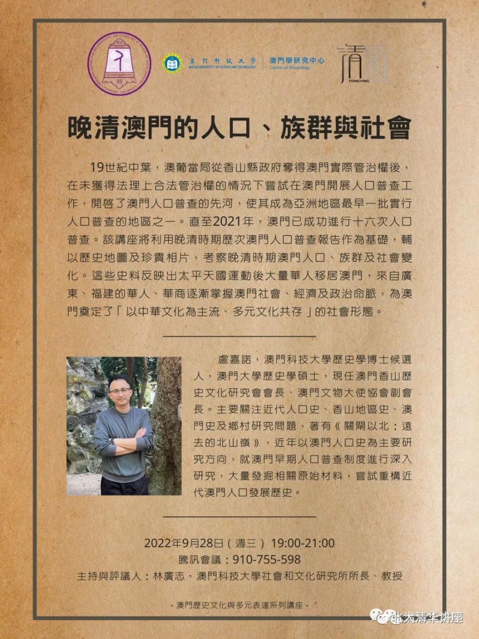 【简介】该讲座将利用晚清时期历次澳门人口普查报告作为基础,辅以历史地图及珍贵相片,考察晚清时期澳门人口、族群及社会变化