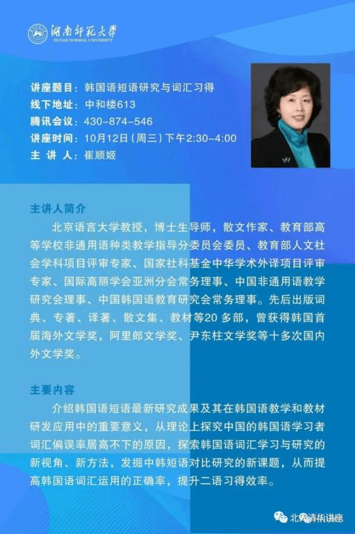 【主讲】崔顺姬(北京语言大学教授,博士生导师,散文作家,教育部高等学校非通用语种类教学指导分委员会委员)