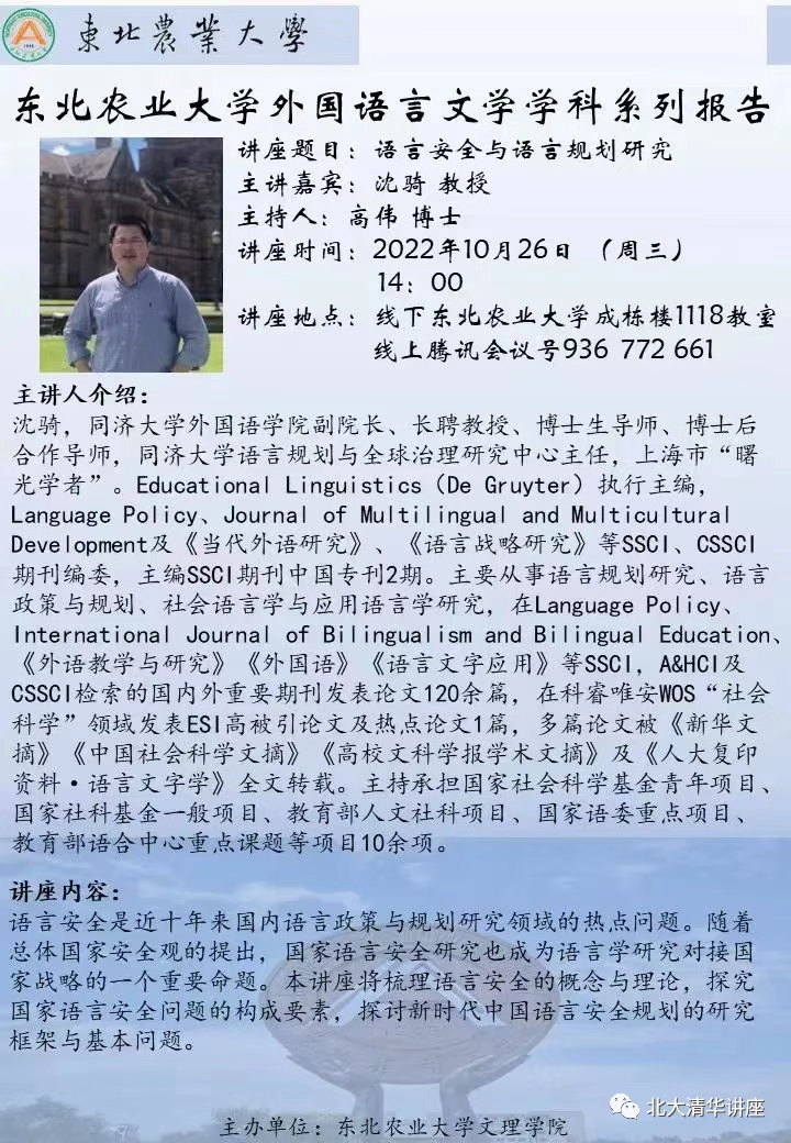 【内容】本讲座将梳理语言安全的概念与理论,探究国家语言安全问题的构成要素,探讨新时代中国语言安全规划的研究框架与基本问题。