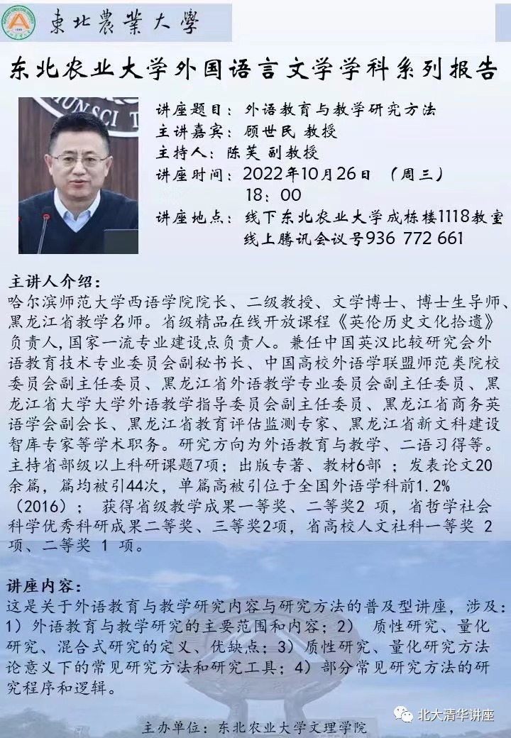 【内容】本次讲座将讲述外语教育与教学研究的主要范围和内容、质性研究、量化研究、混合式研究的定义、优缺点等等