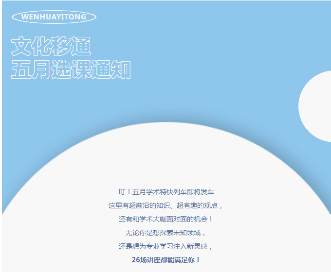 5.如有同学因事退课,本月讲座的补选将于讲座开始前在微信公众号“文化移通”与微信小程序“指尖派”系统内发布补选通知,进行集中补选,请各位同学关注各平台补选通知。