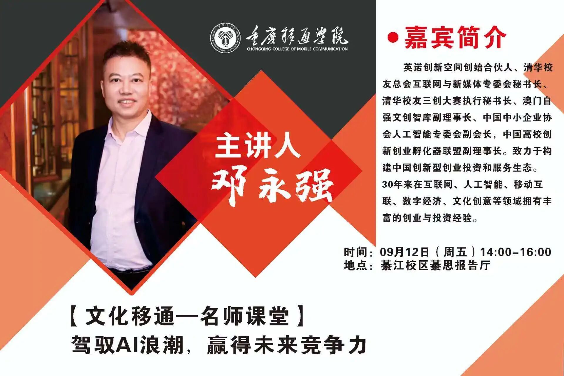 【綦江校区讲座预告】名师课堂|邓永强《驾驭AI浪潮,赢得未来竞争力》