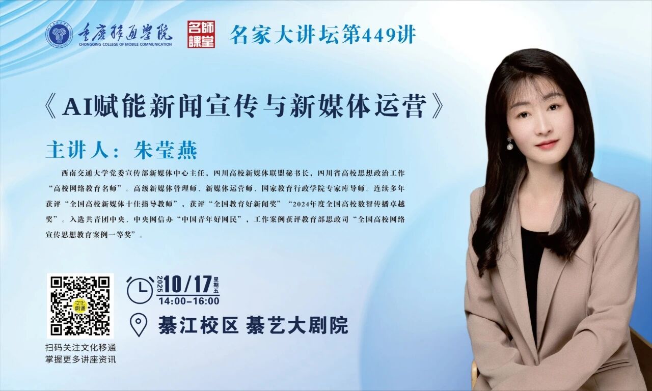 【綦江校区讲座预告】名家大讲坛第449讲 | 西南交通大学党委宣传部新媒体中心主任朱莹燕《AI赋能新闻宣传与新媒体运营》