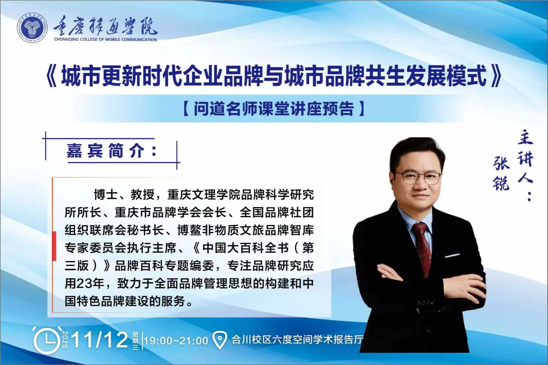【合川校区讲座预告】问道名师课堂 | 张锐《城市更新时代企业品牌与城市品牌共生发展模式》